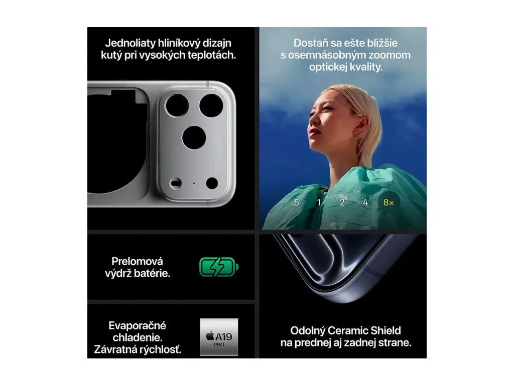 ČIP A19 PRO. CHLADENÉ PAROU. BLESKOVO RÝCHLY— A19 Pro je doteraz najvýkonnejší čip pre iPhone, ktorý poskytuje až o 40 percent lepší trvalý výkon.